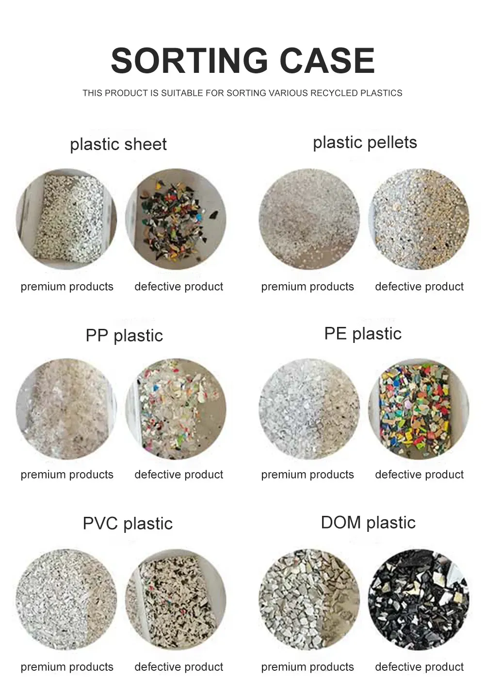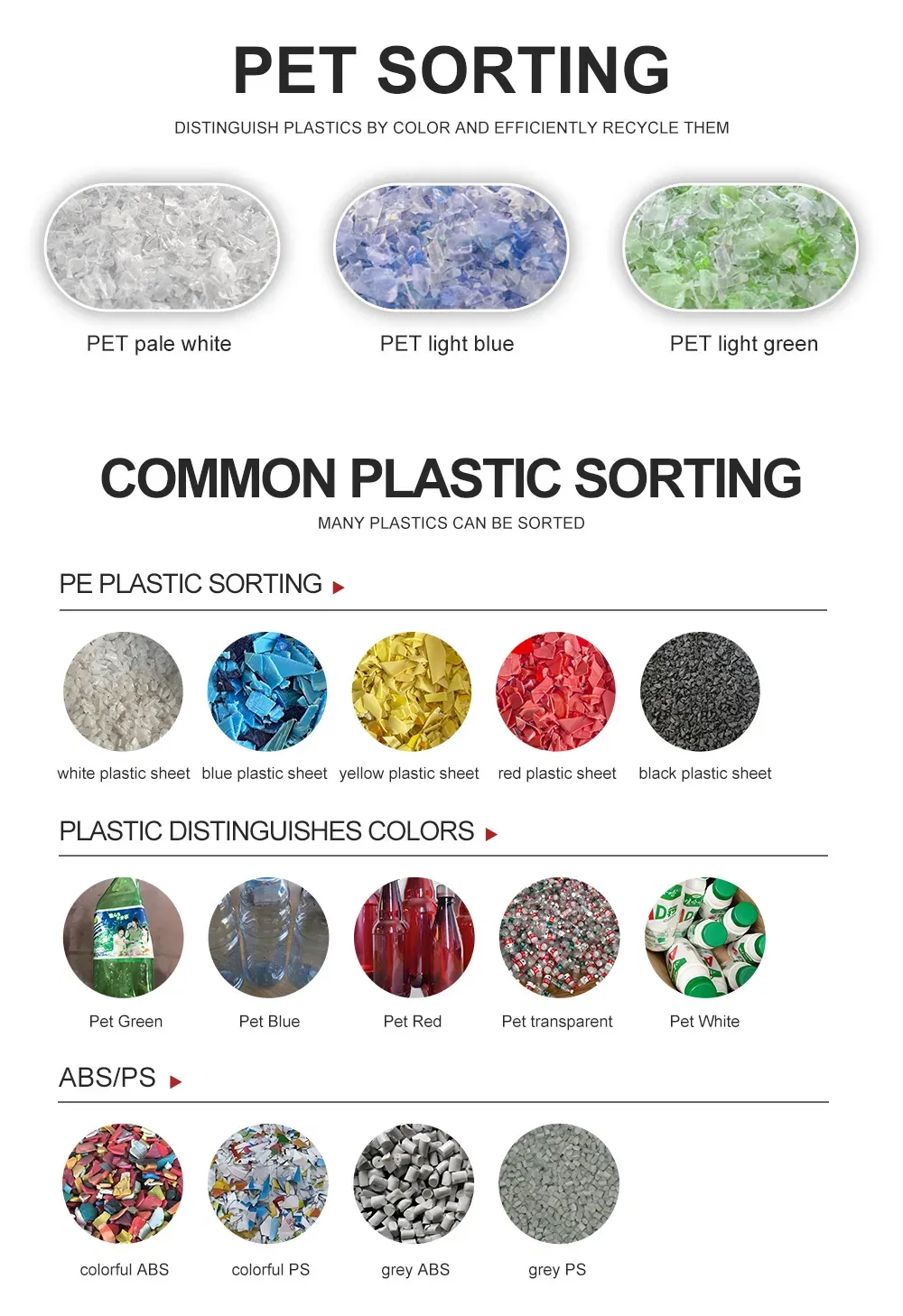 The Plastic Color Sorter is specially designed for the recycled plastics industry. Utilizing advanced optical recognition technology, it can quickly and accurately sort plastic flakes by color, material type, and variety. This equipment effectively separates off-color materials, impurities, and different plastic materials from mixed plastics, significantly improving the purity and economic value of recycled plastics. It is a revolutionary piece of equipment for the plastic recycling sector.